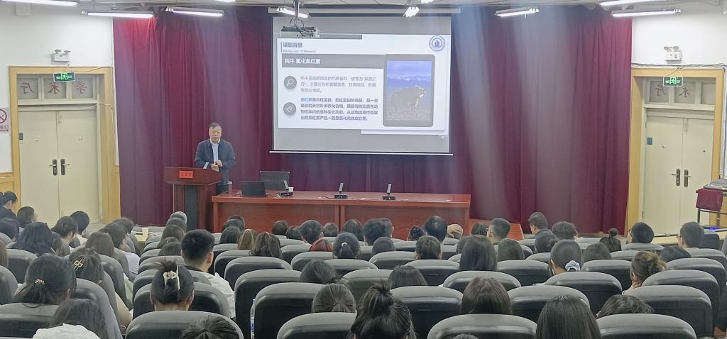 報(bào)告中,李志忠教授圍繞提取純化氯化血紅素、對牦牛血液資源化利用、提升牦牛產(chǎn)品的附加值等方面,介紹了牦牛作為高原珍稀動物之一,常年生存在高海拔缺氧的雪線邊緣,進(jìn)化過程賦予了牦牛獨(dú)特的血液代謝功能。針對我國牦牛血液綜合利用和高值化利用滯后、產(chǎn)品純度低等問題,運(yùn)用超聲波破碎技術(shù)、酶解技術(shù)、膜分離和層析技術(shù)等現(xiàn)代高新生物技術(shù)對牦牛血液資源的高附加值生物轉(zhuǎn)化進(jìn)行集成與產(chǎn)品研發(fā),制備出氯化血紅素產(chǎn)品,篩選出具有ACE抑制活性較好的小肽。學(xué)術(shù)報(bào)告會后,李志忠教授為師生分享了自己讀書的感悟,指出“讀書是一輩子的事”,鼓勵師生“為目標(biāo)多讀書、為生命讀好書、為健康好讀書、為財(cái)富慧讀書、為真善讀出美”,激勵生科學(xué)子堅(jiān)定專業(yè)自信,學(xué)好生命科學(xué),助力生命健康。