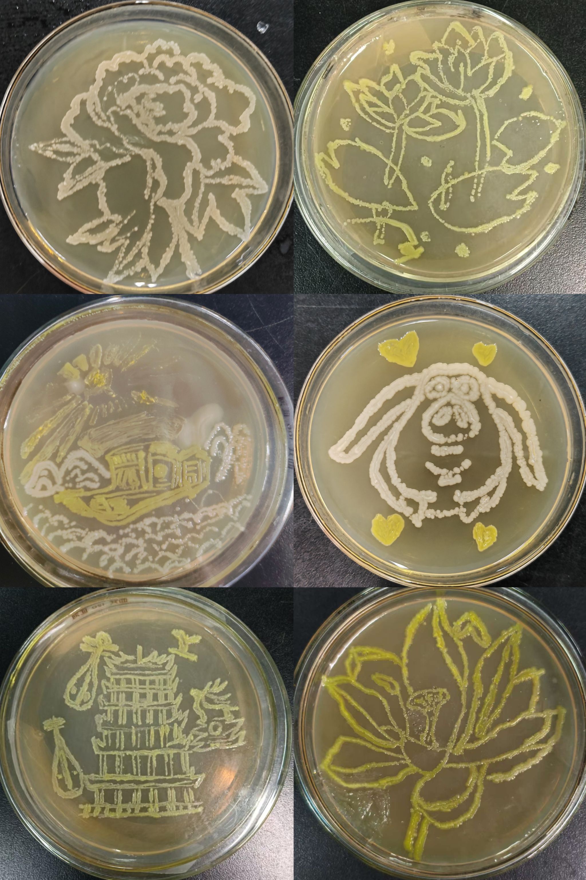 大賽圍繞“創(chuàng)意性、科學性、原創(chuàng)性、安全性”四大核心要求展開。參賽選手需要利用微生物培養(yǎng)技術完成一件兼具科學原理與藝術美感的作品,作品不僅需體現微生物的生長特性與形態(tài)結構,還需通過藝術設計展現獨特創(chuàng)意。選手們以微生物菌落為“畫布”,通過控制菌種分布與培養(yǎng)條件,繪制出特色建筑、美麗花卉、抽象圖案等作品,將菌落培養(yǎng)的技術符號化為藝術元素,賦予作品更深層的科學內涵。評委從科學性、藝術性、創(chuàng)新性等多維度對作品進行綜合評分,最終評選出了一、二、三等獎共6名。
