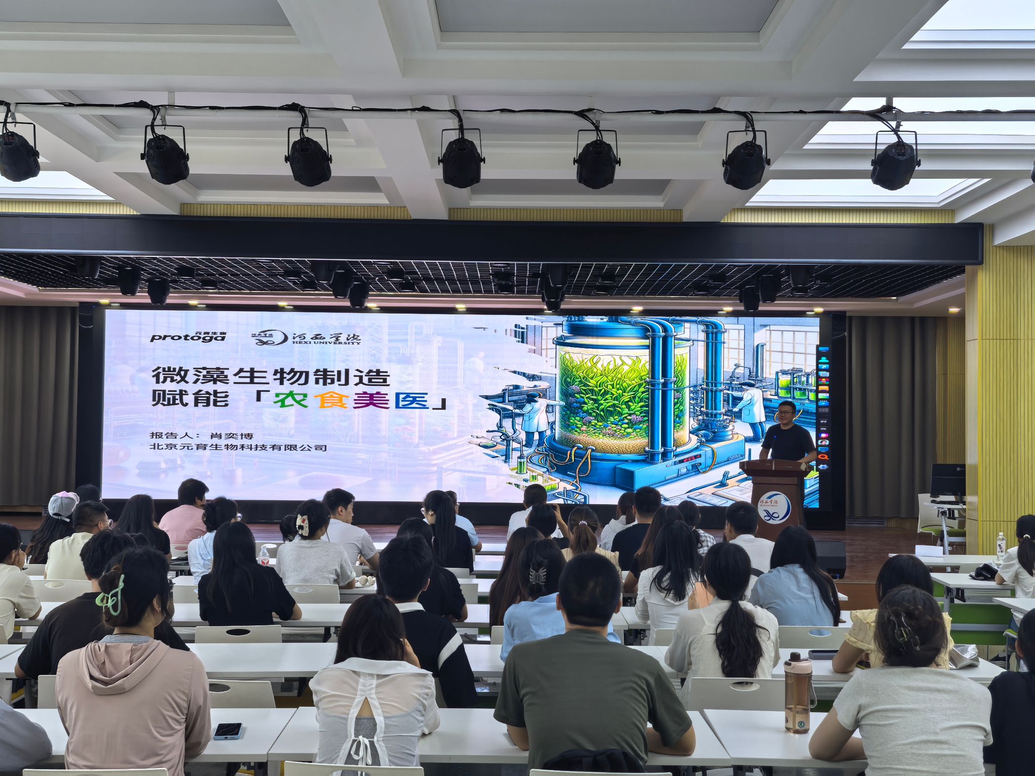 在報告中,肖奕博博士詳細介紹了微藻生物制造的原理與技術路徑,闡述了微藻作為一種高效生物資源在農業(yè)、食品、美容和醫(yī)療等領域的巨大應用潛力。他指出,微藻富含多種生物活性物質,通過現(xiàn)代生物工程技術,可以將其轉化為高附加值的產品,為相關產業(yè)帶來創(chuàng)新動力。同時,肖博士結合自身創(chuàng)業(yè)經歷,分享了他在創(chuàng)業(yè)過程中歷經的艱辛與挑戰(zhàn)。從技術研發(fā)的瓶頸到市場開拓的艱難,從資金短缺的困境到團隊建設的挑戰(zhàn),他坦誠地分享了每一個艱難時刻的應對策略。他鼓勵在場的學生要有敢于冒險的精神和堅韌不拔的毅力,勇于追求自己的創(chuàng)業(yè)夢想。報告結束后,肖奕博博士還與現(xiàn)場師生進行了互動交流,解答了大家關于微藻生物制造技術、創(chuàng)業(yè)策略以及未來發(fā)展趨勢等方面的問題。
