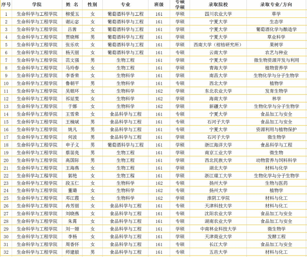 2020年,學(xué)院有畢業(yè)生136人,其中57人報考了“雙一流大學(xué)”的一流大學(xué)建設(shè)和一流學(xué)科建設(shè)等高校的碩士研究生,報考率為41.91%;上線人數(shù)35人,上線率61.40%;除3人因特殊原因自動放棄被錄資格外,其余32人均被錄取,錄取率91.42%。其中,2人分別被一流大學(xué)建設(shè)高校云南大學(xué)和新疆大學(xué)錄取,15人分別被西北大學(xué)、西南大學(xué)和南昌大學(xué)等一流學(xué)科建設(shè)高校錄取,被“雙一流大學(xué)”錄取的錄取率為54.29%,所錄學(xué)校分布于華南、華西、華東、東北和西北各區(qū)共16個省份。